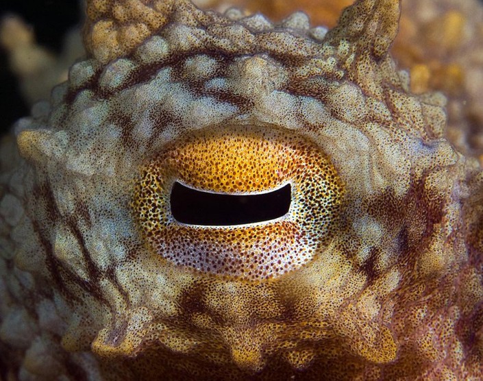 У осьминога прямоугольный зрачок, что дает обзор на все 340 градусов. У человека, кстати, всего 190 градусов.