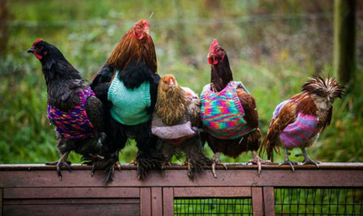 Две англичанки вяжут свитера для куриц, которых "отправили на пенсию". Курицы всю жизнь прожили в клетках и не могут уже приспособиться к погодным условиям.
