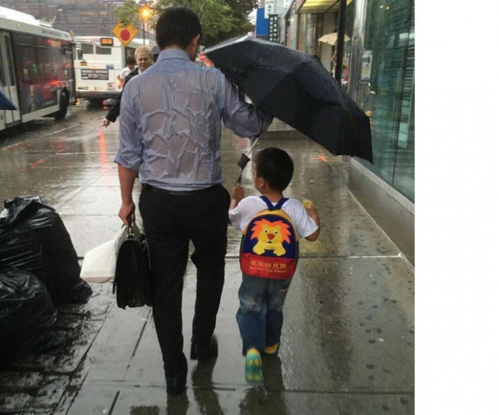 В принципе ничего удивительного, но все равно безумно трогательно - папа заботится, как бы его сын не промок во время ливня.