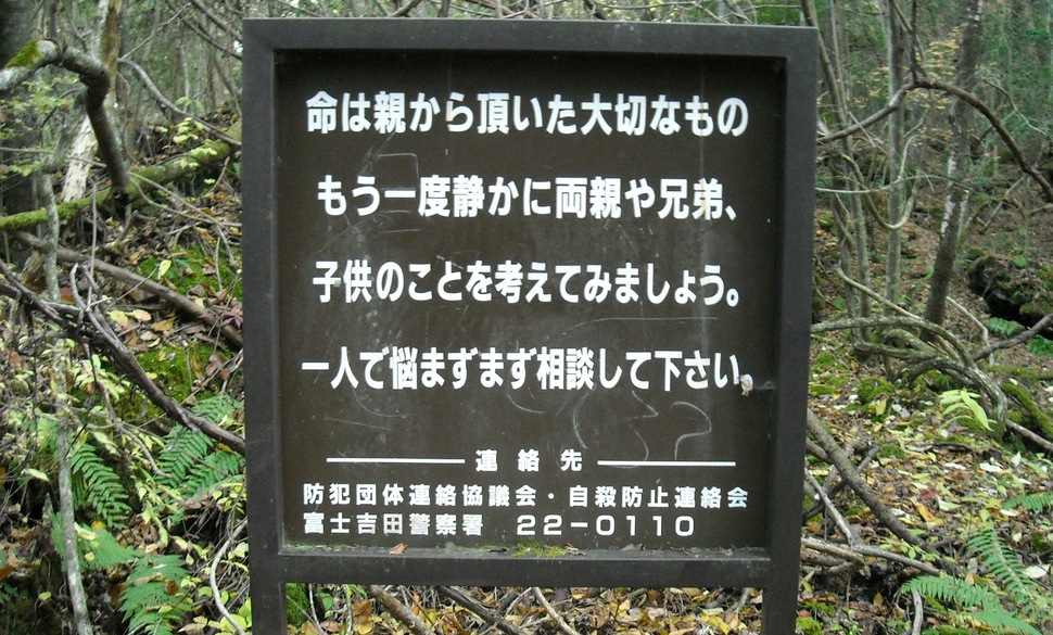 Лес Аокигахара расположен у подножия горы Фудзи, где более 500 человек покончили жизнь самоубийством, начиная с 1950 года. Чиновники даже установили знак, надпись на котором гласит: "Ваша жизнь - это драгоценный дар ваших родителей" и "Пожалуйста, обратитесь к сотрудникам полиции, прежде чем убить себя".