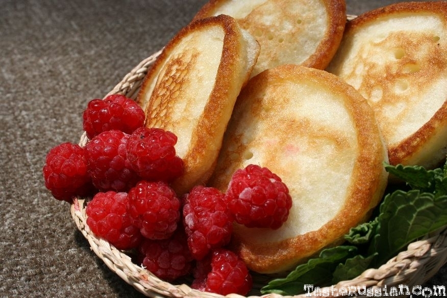 Завтрак в России. Оладьи из пшеничной муки, которые обычно подаются с вареньем, медом, сметаной или свежими фруктами.