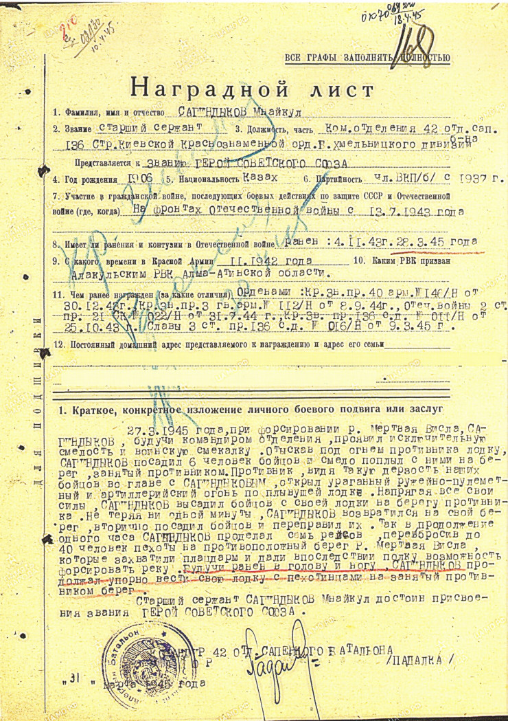 Наградной лист М. Сагиндыкова, 31 марта 1945 года. Фото из книги "Забытые герои. Герои Советского Союза"