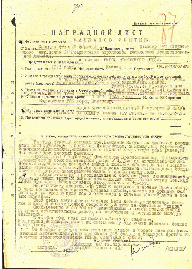 Наградной лист З. Байжанова, 14 августа 1944 года. Фото из книги "Забытые герои. Герои Советского Союза"