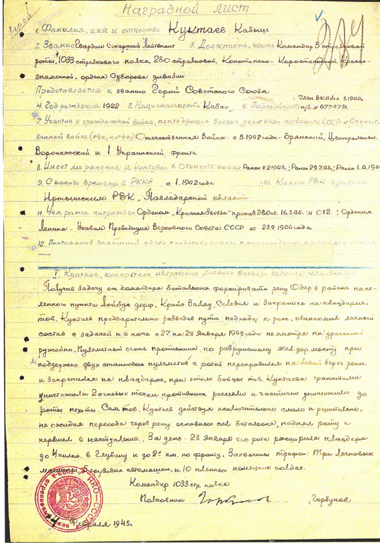 Наградной лист К. Куктаева, 4 февраля 1945 года. Фото из книги "Забытые герои. Герои Советского Союза"