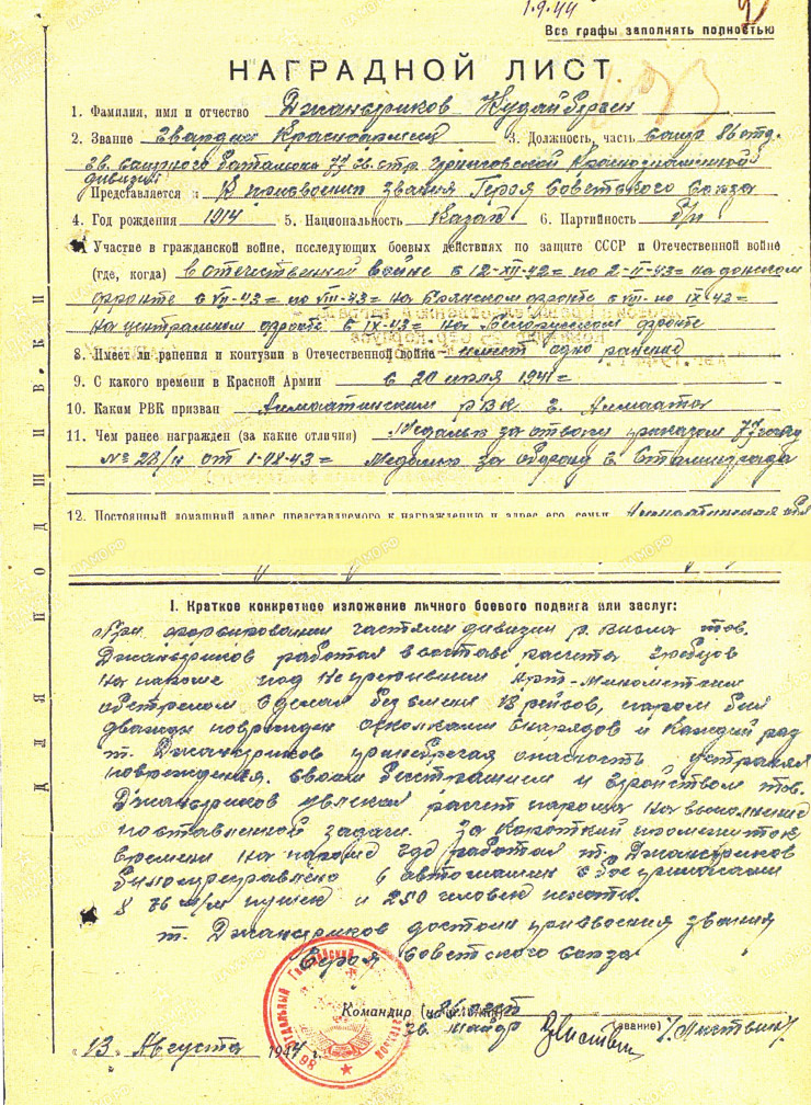 Наградной лист К. Джансерикова, 13 августа 1944 года. Фото из книги "Забытые герои. Герои Советского Союза".