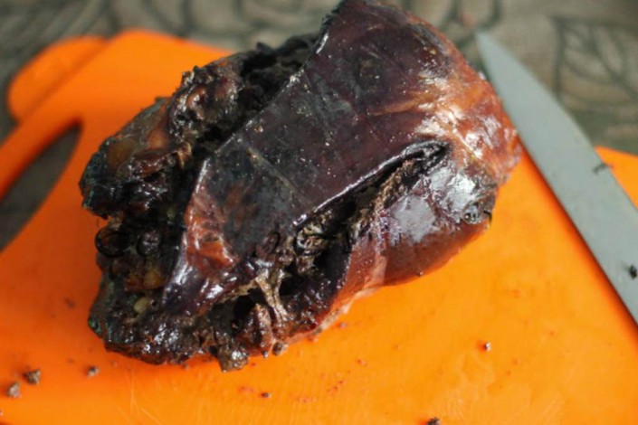 "Это блюдо очень оригинальное, и редко кто отваживается его заказать. Конское сердце даже после приготовления бывает обычно очень жестким, - делится подробностями рецепта Еркебулан. - Поэтому, чтобы оно немного смягчилось, из него выжимают всю кровь, надрезают в нескольких местах так, чтобы в эти разрезы, как между страниц книги, можно было вложить бараний курдюк и печень. Все это солят, перчат, а затем заворачивают и перевязывают бечевкой. Затем сердце кладут в мешок с мукой и оставляют в прохладном месте на месяц. Когда приходит срок, его готовят целиком в фольге или кулинарном мешке. Получается очень вкусное и мягкое мясо".
