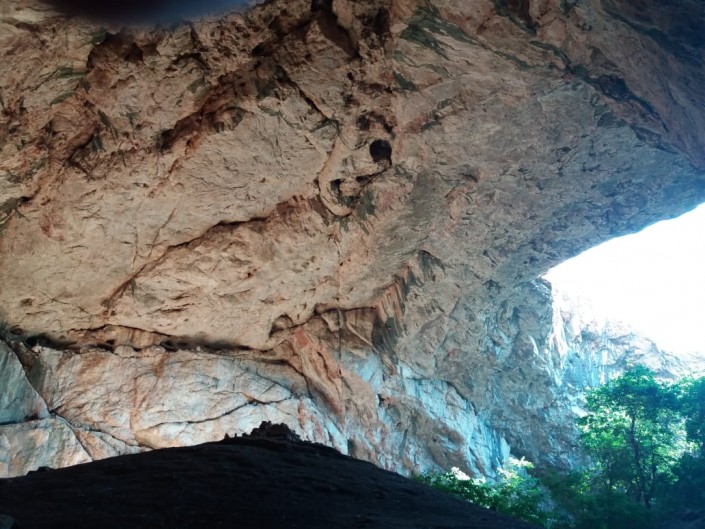 По одной из них, рассказывает нам наш гид, в этой пещере долгие годы жил большой и злой дракон. Он приносил много бед местному населению, пожирал их скот. Когда дракон взлетал, то задевал крыльями часть свода и поэтому она рушилась. Конец его пагубным действиям положил пророк Сулейман. Он посадил чудище на цепь. Гид указывает нам место, где спал этот дракон - самый центр пещеры, куда попадают солнечные лучи.