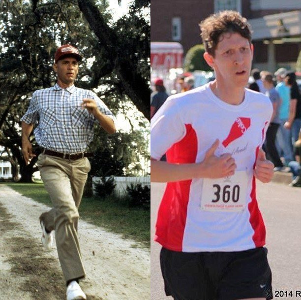 Как в фильме, Форресту кричали "Беги, Форрест, Беги", точно так же подбадривали его те, кто узнал Майкла во время его участия в марафоне 10K (забег на 10 тысяч метров).