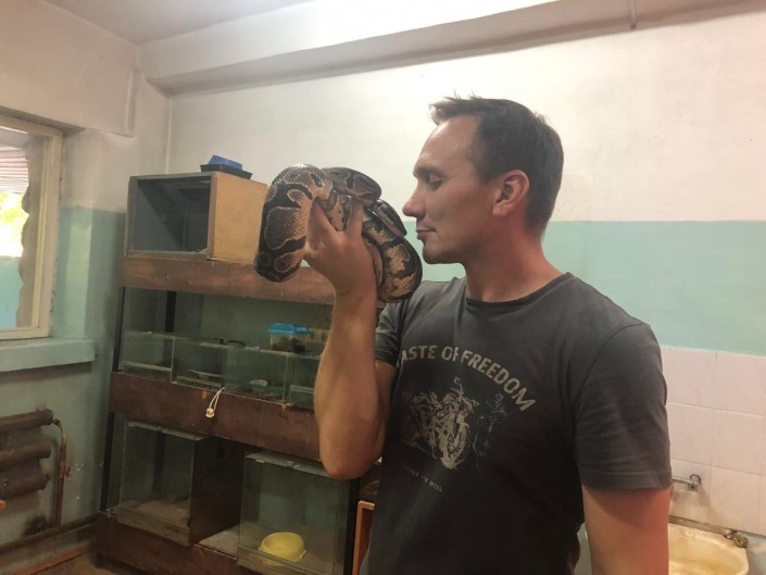 38-летний Александр Гурнев с 1997 года работает в Алматинском зоопарке. Сейчас заведует экзотариумом (место содержания и показа посетителям экзотических животных), в котором проживают 76 змей 39 видов. К каждому из этих животных нужно найти индивидуальный подход. Для змеи создаются условия, повторяющие климат в их родных странах, учитывается время ее размножения.