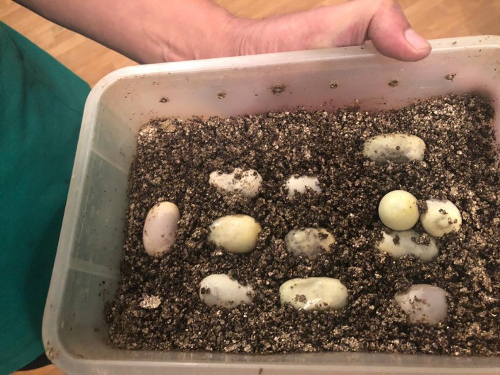 "Бывает, змея во время родов откладывает неоплодотворенные яйца. А иногда только часть из них оплодотворенная. Также сталкиваемся со случаями, когда некоторые яйца откладываются, а остальные остаются в яйцеводах. Тогда мы проводим так называемое кесарево сечение, проводим операцию, вынимаем яйца из яйцеводов, зашиваем обратно. Яйца перемещаются в инкубатор, в среднем на 60 суток, потом вылупляются детеныши", - рассказывает собеседник, показывая яйца змей.
