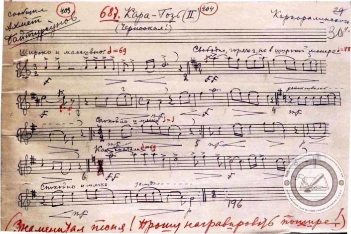 Нотная запись байтурсыновского варианта песни "Кара-Коз" .Фото предоставлены Центральным Государственным архивом Республики Казахстан.