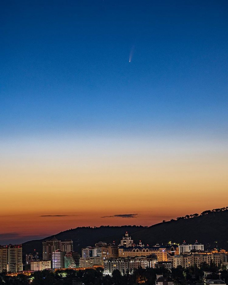 "Эта комета ярчайшая за последние семь лет, поэтому заранее готовился к съемке, нашел подходящую локацию и подождал хорошей погоды. В 4 утра сделал эти снимки с 200-миллиметровым телеобъективом. Комета будет видна приблизительно до 20 июля. Сейчас в Алматы ее видно с 3.30 до 4.30 низко над северо-восточным горизонтом. Комету снял с одного из холмов в Ремизовке. Оттуда хороший вид как раз на северо-восточную часть горизонта", - поделился автор фотографий.