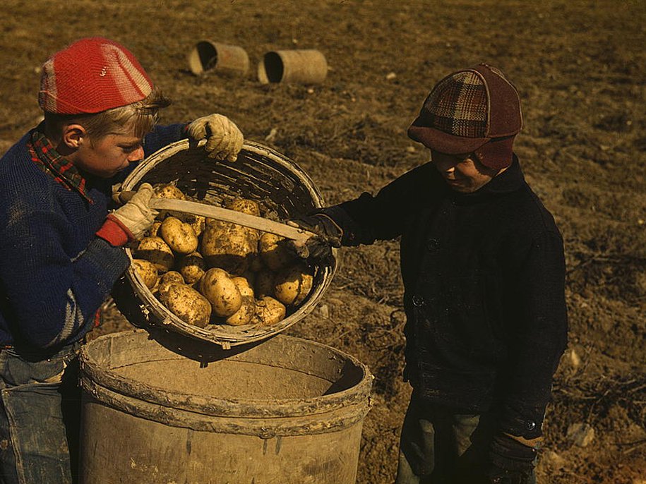 Дети убирают картофель на полях вблизи Карибу, штат Мэн. Школы не открывались до тех пор, пока урожай не будет убран. Октябрь 1940 года