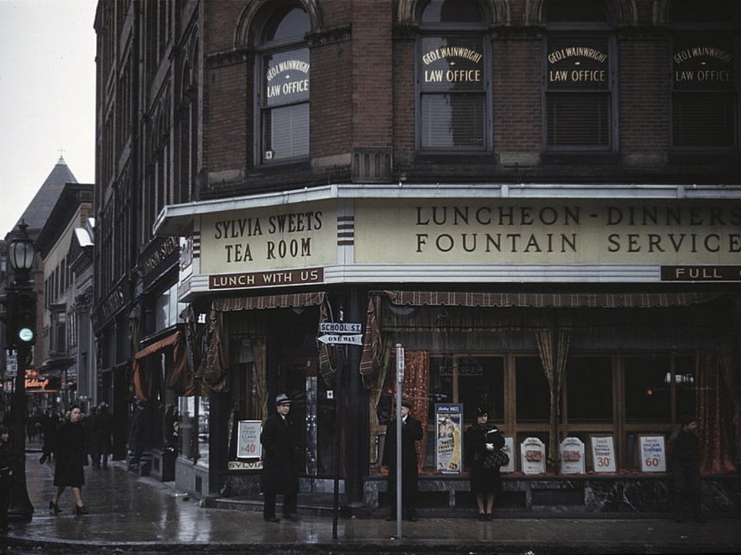 Чайная Sylvia Sweets, Броктон, штат Массачусетс, декабрь 1940 или январь 1941 года. Фотограф Джек Делано