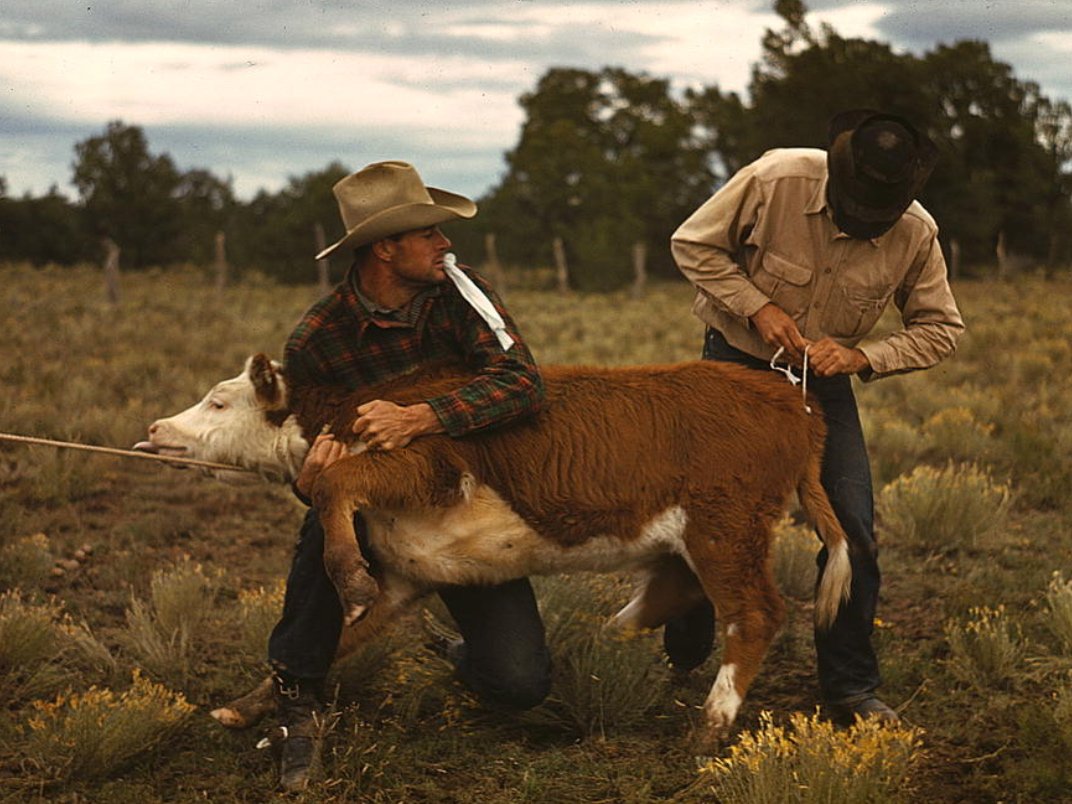 Привязывание ленты на хвост теленка перед родео в Пай-Тауне, октябрь 1940 года.