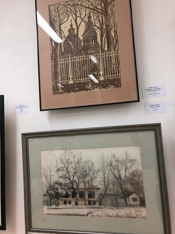 Верхняя картина М. Ержанова, "Кафедральный собор" 1973 год. Нижняя Р. Великанова, "Домик" 1973 год.