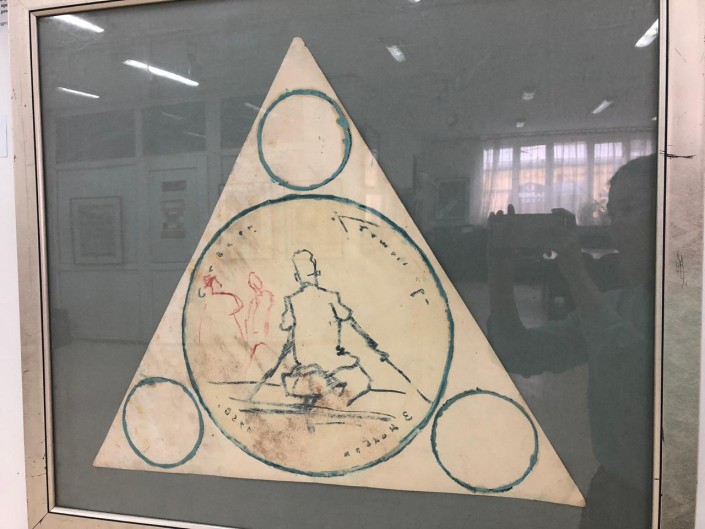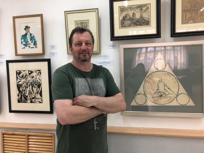 "Это автопортрет Калмыкова. Здесь он со спины, сидит на корточках за работой. У него были большие кисти, которыми он расписывал декорации в театре. Эти кисти настолько огромны, почти такие же, которыми мы подметаем пол. Их он прикреплял к палке и красил. Треугольник – фишка художника, он любил космические фигуры и тематику", - пояснил директор галереи "Улар".