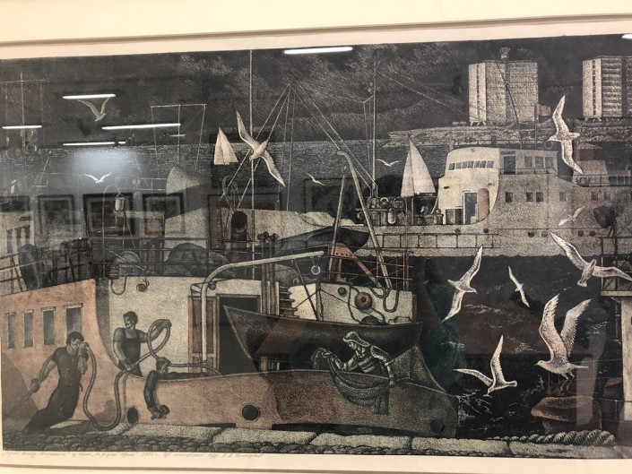 На выставке можно увидеть три картины с изображением моря мастера станковой графики, пастели, гуаши Андрея Дячкина. Это Каспий в Атырау, Актау.