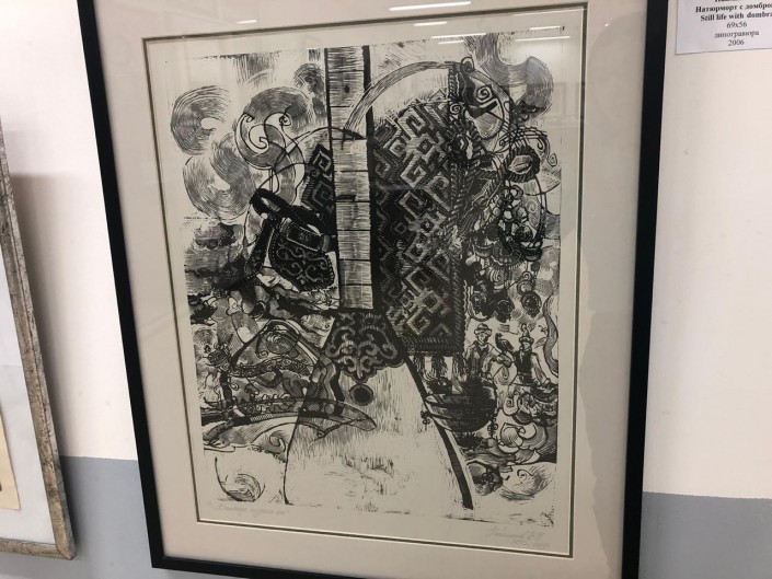 Современный художник предпочитает в своих работах знакомить зрителей с казахской культурой и традициями. Тому свидетельство домбра на фоне дастархана.