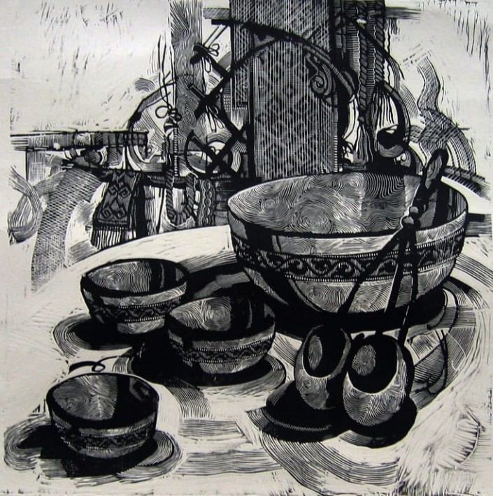 Бауыржан Найманов искусно не только рисует, но и преподает графику. В одной из его гравюр весьма оригинально в национальном стиле "выколот" сокол.