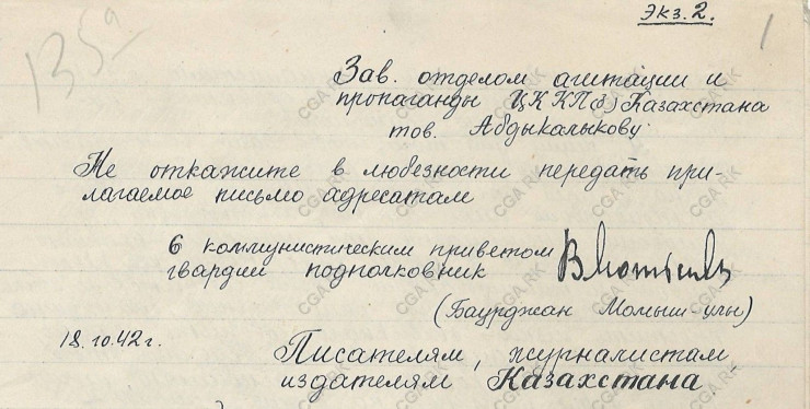 Б. Момышұлының Қазақстан Жазушылар одағына жазған хатының 2-ші данасынан үзінді. Қазақстан Республикасы Орталық мемлекеттік архиві қорларынан.