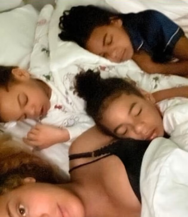 На снимке звездная певица лежит в постели в окружении своих детей: 10-летней дочери Блю Айви и пятилетних Руми и Сэра, сладко спящих рядом с ней в кровати.
