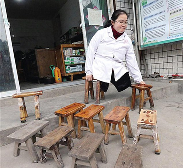 Девушка потеряла обе ноги в 1983 году, когда шла в детский сад. Она выбежала на дорогу и попала под колеса грузовика. Жизнь Ли поменялась в одно мгновение. В 8 лет она заново научилась "ходить". Девушке помогают две деревянные табуретки.