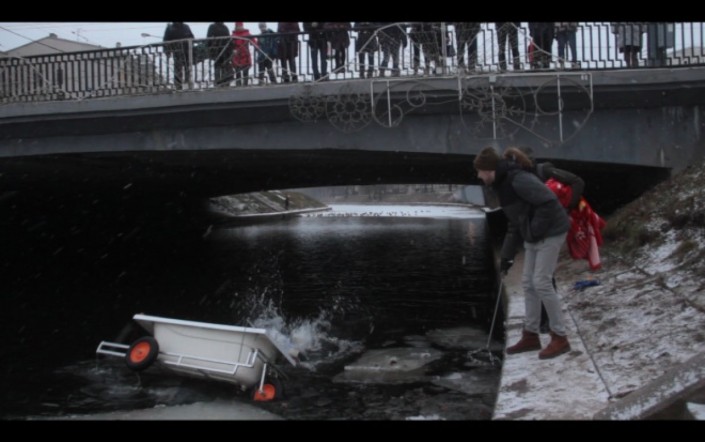 Перед тем как протестировать "машину" на воде, он попытался прокатиться на ней по дороге. Молодой человек проплыл по реке, используя швабру в качестве весел. Во время швартовки к набережной транспорт перевернулся.