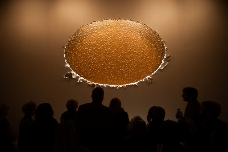 Произведение "Круглая ли Земля" было приятно для восприятия, но совсем не цифровое. Жидкая грязь стекала с большого овала на стене.