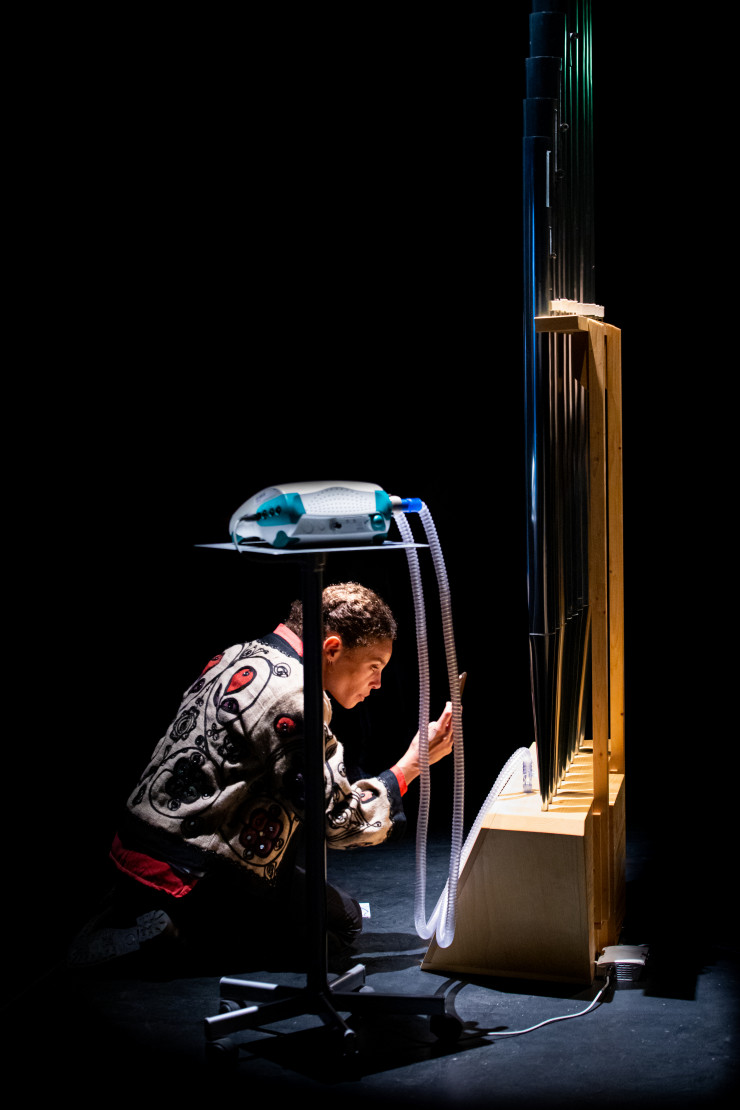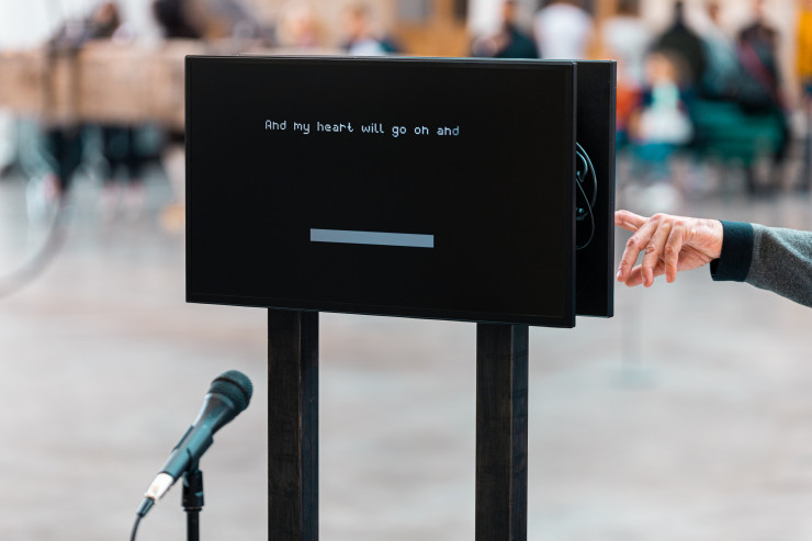 Еще один экспонат "О чем поют машины" состоял из микрофона, перед которым экран выдавал тексты - видимо, строчки из песен. Искусственный кто-то пел что-то на языке роботов, издавал звуки ненастроенной гитары.