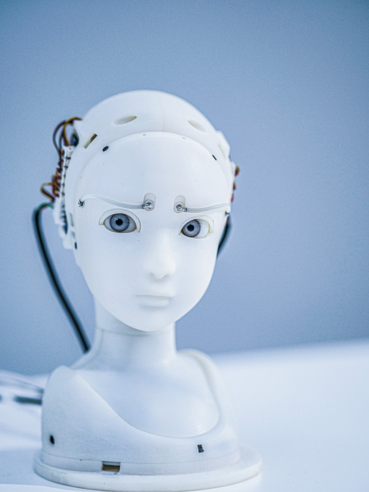 Наконец, робот-ребенок. То есть маленький пластиковый бюст с детскими глазами. Шея двигается, брови поднимаются, глаза проникновенно смотрят в самую душу. Наверное, это олицетворение наших надежд на новые информационные технологии, которые помогут нам почувствовать себя еще человечнее.