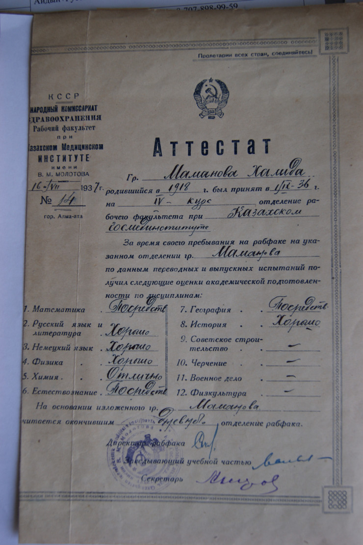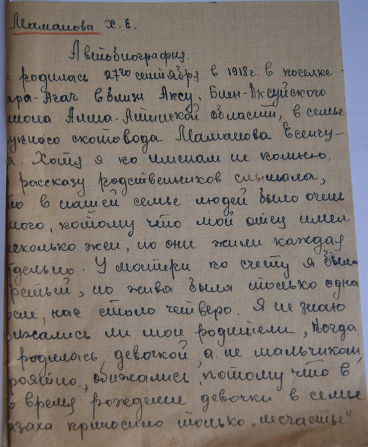 "Мое воспитание было несколько лучше, чем у детей из бедных семей, которые жили в бараках моего отца. Хотя я была ребенком, было ясно, что отличаюсь от других ребят. Видела, как люди унижались перед моим отцом, а их чада - передо мной. Когда я стала взрослой, мне было больно вспоминать об этом", - писала в автобиографии, опубликованной на сайте Казахского национального медицинского университета имени Санджара Асфендиярова, Халида Маманова.