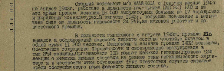 "Старший лейтенант медицинской службы Халида Маманова, работая в должности гинеколога, с августа 1943 года провела 216 выездов и обследований женского личного состава частей, с охватом в общей сумме 11 200 человек. Оказала медицинскую помощь и лечение 1482 женщинам. Обеспечила сохранение беременности и своевременно эвакуировала в тыл 394 женщины. Организовала 128 комнат женской гигиены. Провела 584 лекции с женским личным составом на разные темы гигиенического характера и, в частности, этим обусловила факт отсутствия случаев сифилиса среди обслуживаемого женского личного состава", - говорится в боевой характеристике гинеколога.