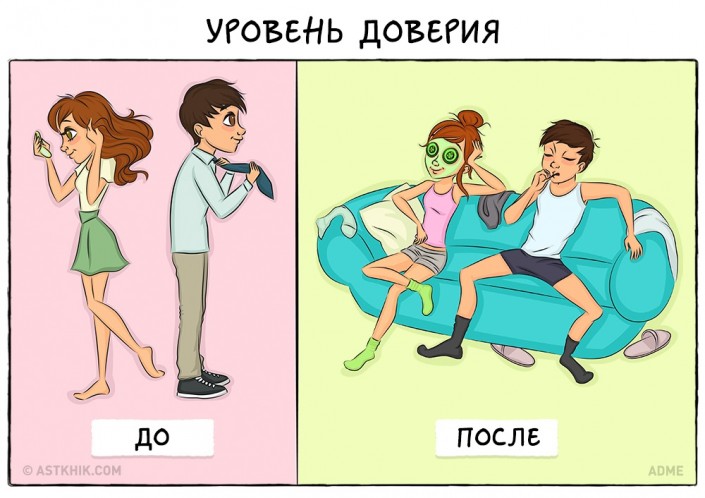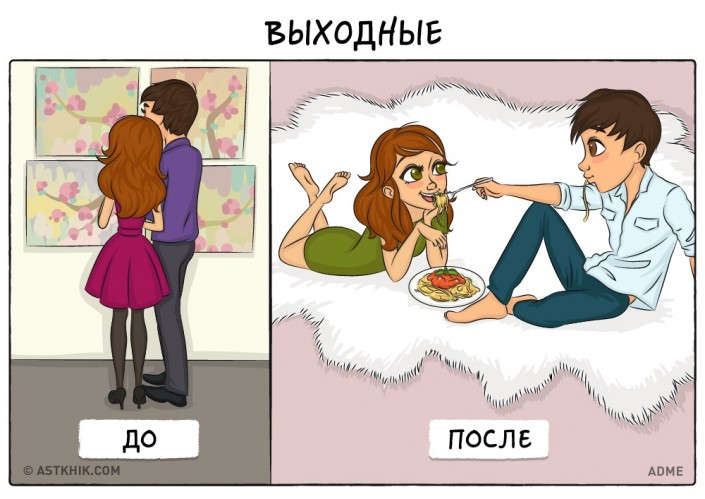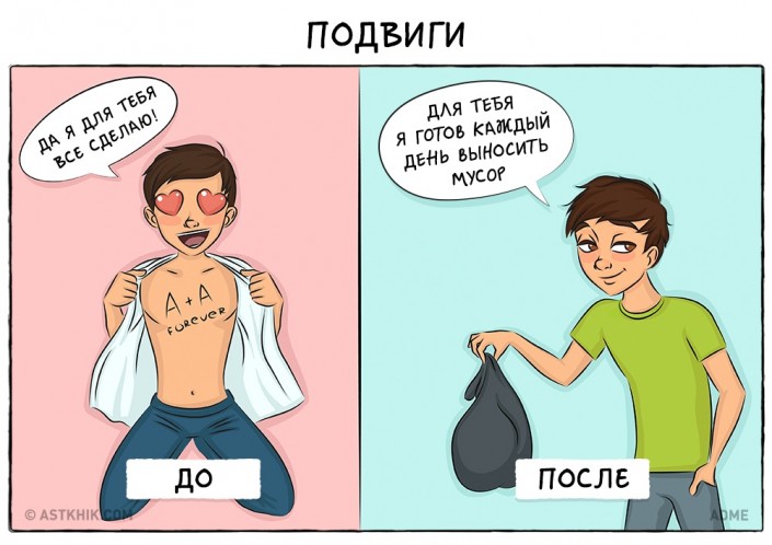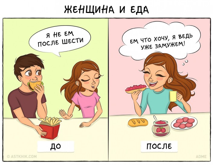 Так ли происходит на самом деле? Или это очередные стереотипы? Ведь по-прежнему в отношениях присутствует романтика, а любовь становится только сильнее. Предлагаем взглянуть на девять иллюстраций, где изображен контраст между жизнью до или после свадьбы. Помните, что в каждой шутке есть доля правды.