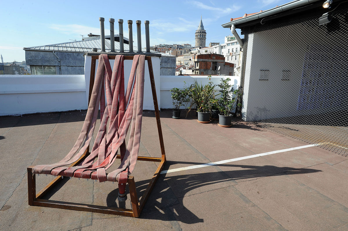 А на крыше выставочного зала был представлен проект о том, как можно сделать улицы и дворы удобнее для жизни с помощью подручных средств. Представленные экспонаты, такие как, например, это кресло из пожарного шланга, провели несколько месяцев на улицах Стамбула.