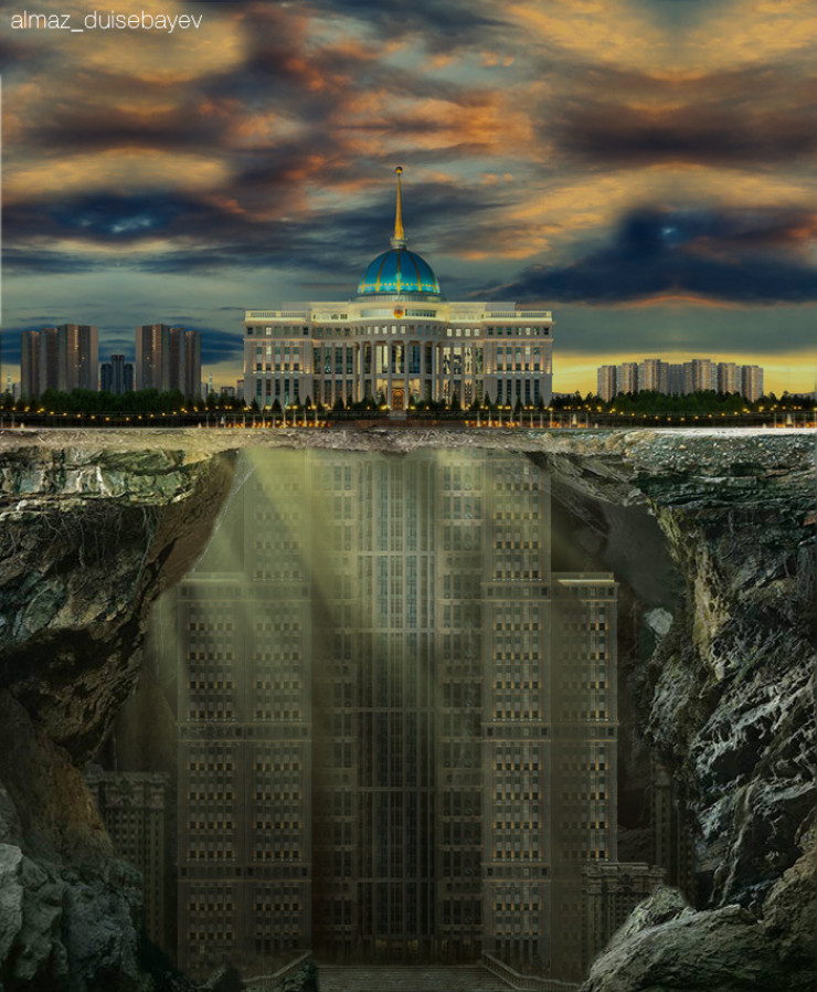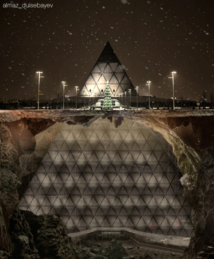 "Я видел подобные иллюстрации на зарубежных сайтах. И у меня возникла идея придумать что-то похожее с нашими зданиями. Так как Нур-Султан известен своими необычными и интересными архитектурными решениями, я решил создать с помощью Photoshop "новую подземную реальность" столичных объектов", - рассказал Алмаз Дуйсебаев.