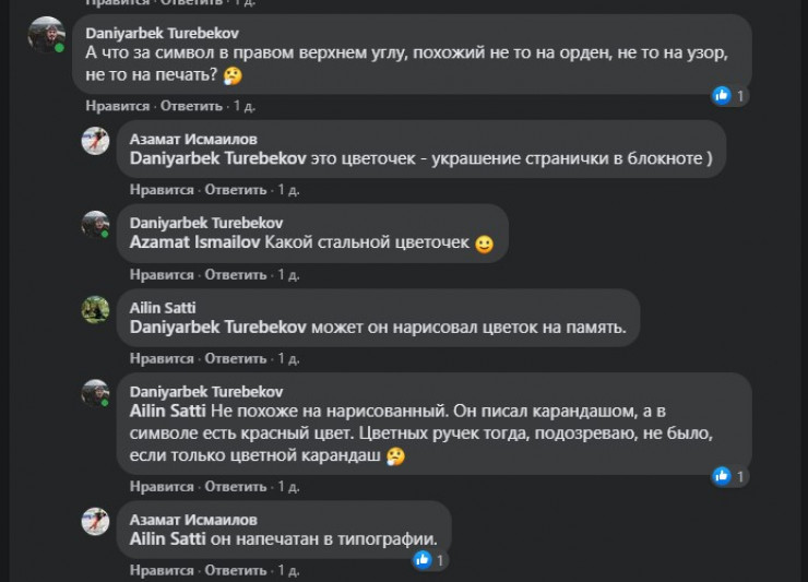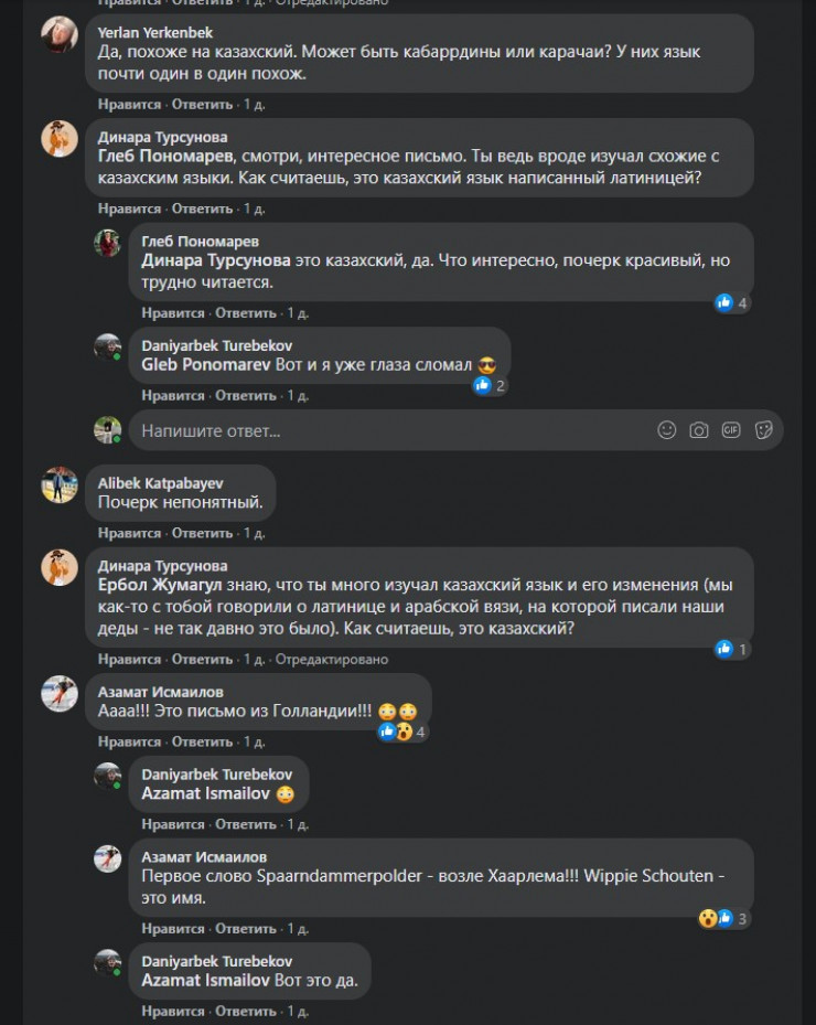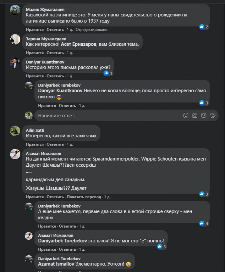 Однако под постом Даниярбека Туребекова со снимком этого письма комментаторы все-таки попытались дешифровать написанное. "Разгадывать" язык начал сам автор поста.