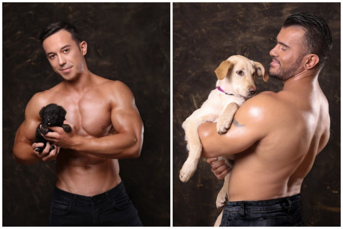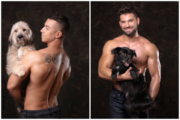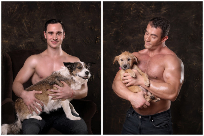 12 волонтеров, среди которых бодибилдеры, пауэрлифтер и ветеринар, с радостью приняли участие в фотосессии. Они фотографировались с собаками из приютов.