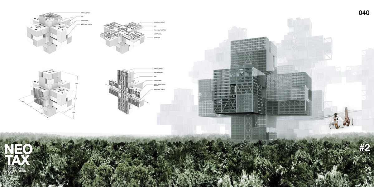 Что, если бы наши города были такими, словно наши архитекторы работали с трехмерной сеткой? Идея принадлежит конкурсу eVolo 2011 Skyscraper Competition и называется NeoTax. Строения, которые растут вверх и далее. Организованные в горизонтальную и вертикальную сетки улиц, здания основаны на модульной системе, где каждый модуль можно рассматривать как отдельное здание, соединенное с другим на уровне земли. Грубо говоря, все мы будем соседями и не будем корчевать зеленые насаждения ради строительства.
