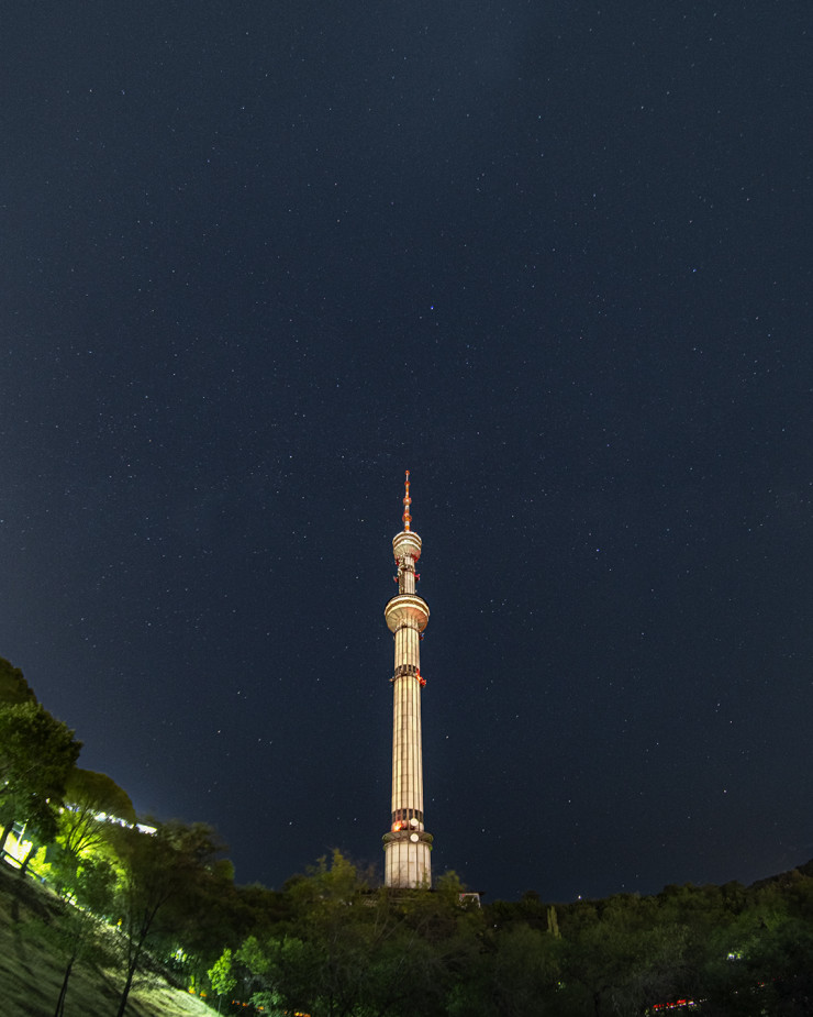 На фото изображена алматинская телебашня на фоне звездного неба, фотограф сделал снимок с холма Кок-Тобе.