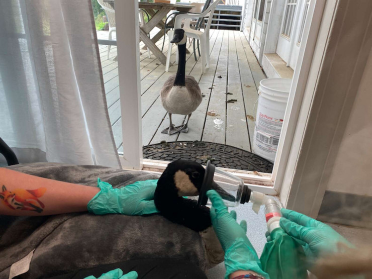 Специалисты отмечают, что не знают, как подруга Арнольда обнаружила гуся. Она была взволнована тем, что не могла проникнуть внутрь. Гусыня оставалась ждать на крыльце на протяжении всей операции, наблюдая за работой ветеринаров.