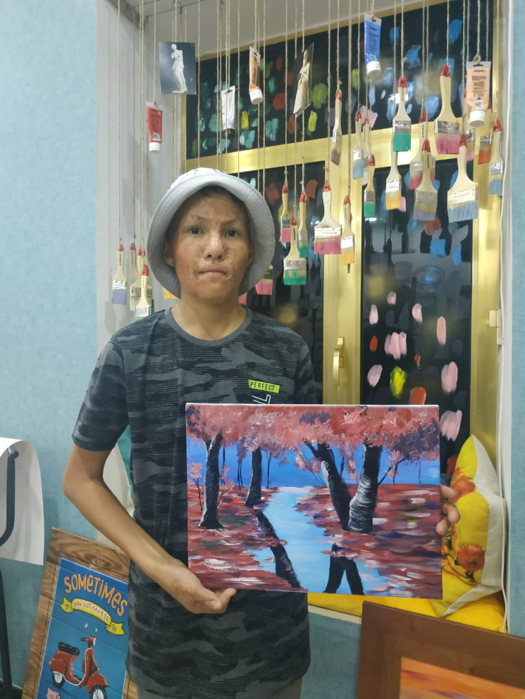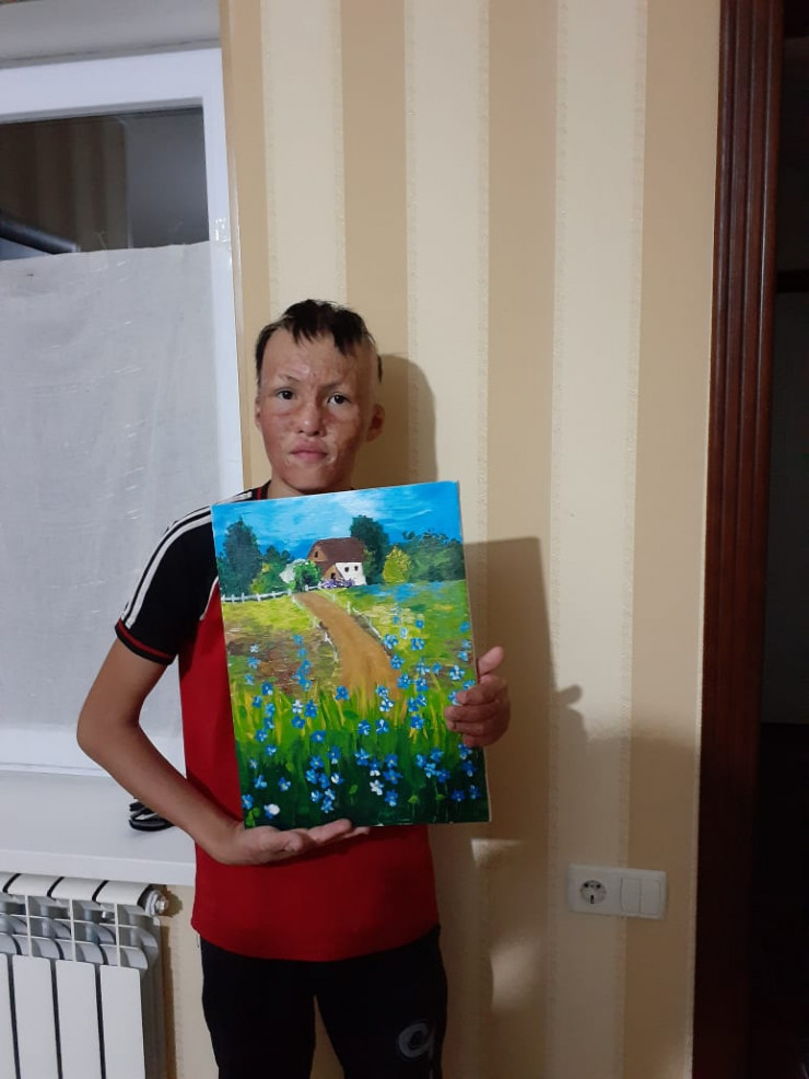 "Видя, как мой ребенок талантливо рисует, волонтеры предложили продавать его картины. Мы никогда об этом не задумывались, но у сына загорелись глаза от той мысли, что он сам сможет зарабатывать на свою операцию. Он сказал: "Буду копить на новое лицо". Учитывая расходы на материалы, предложили за работу 10 тысяч тенге. У нас уже забрали два пейзажа, готовы еще две картины.