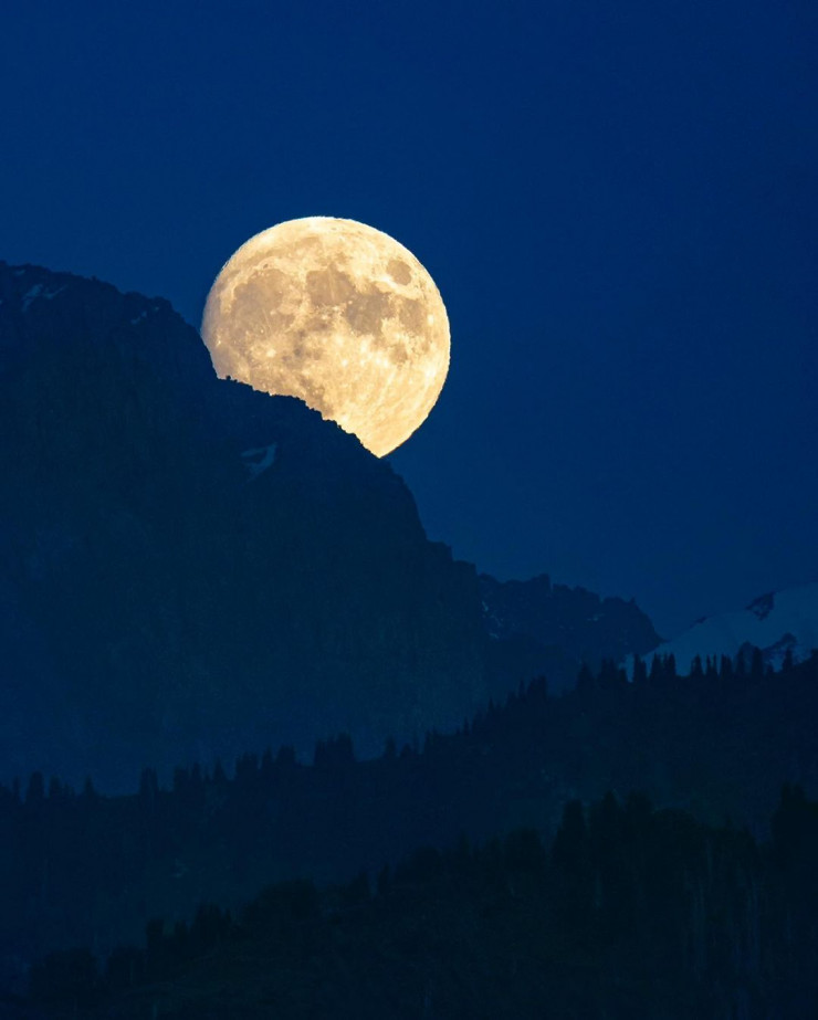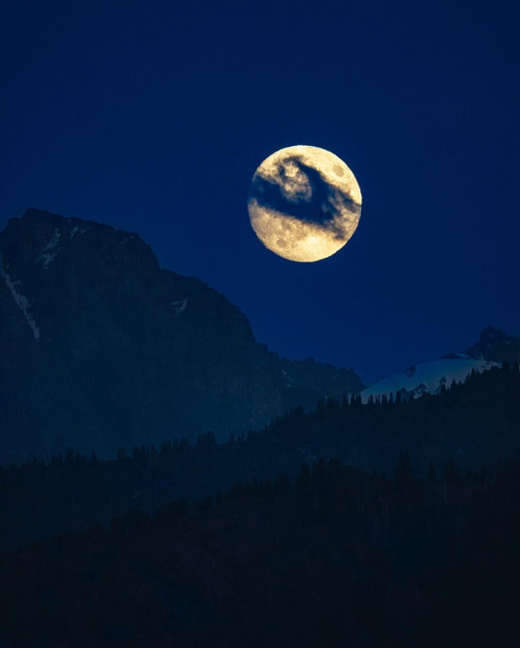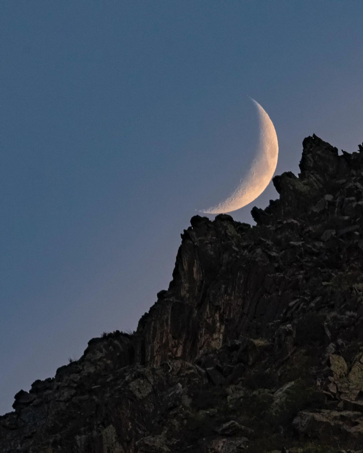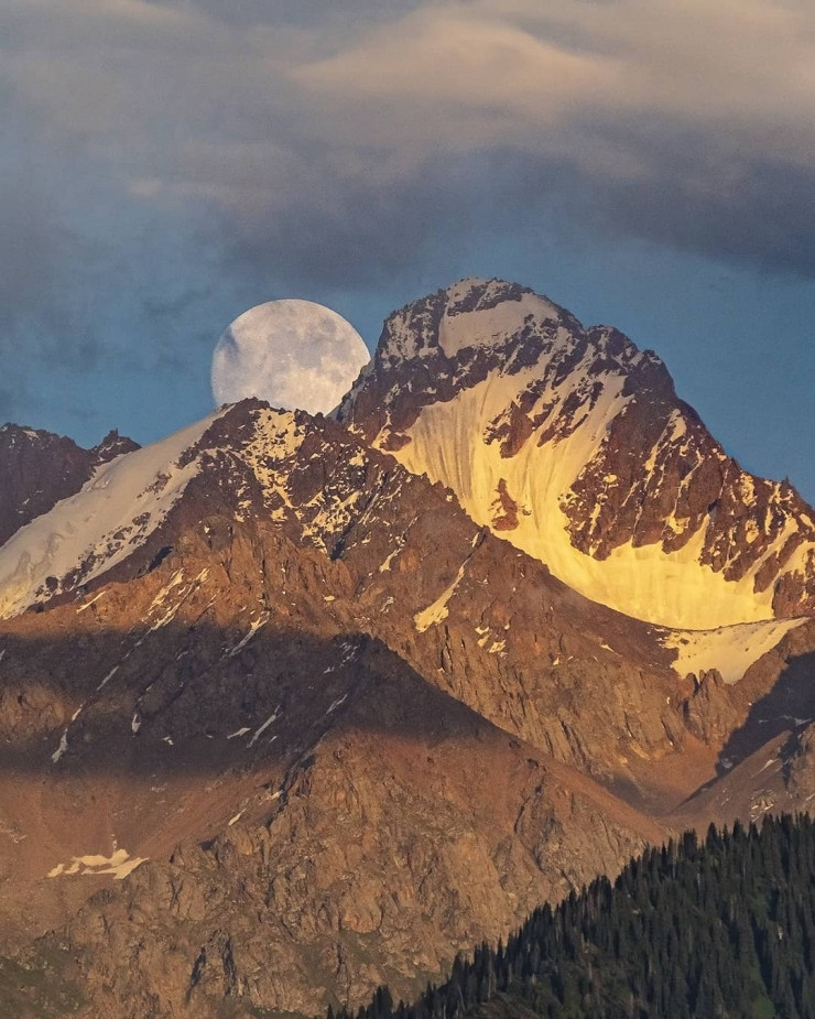 Момент восхода луны над пиком Нурсултан, когда совпадает время восхода луны и захода солнца, фотограф ждал три месяца.