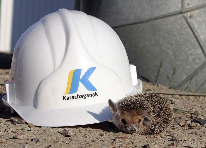 "У меня были и костюм, и каска - все, что необходимо по технике безопасности. Я положил ежика в каску, взял с собой. Думаю, надо сфотографировать интересно. А народ только идет на утреннюю смену. Я положил ежика на пешеходную дорожку, где они проходят, а он лежит - не шевелится. Чувствует запах людей, притих. Я его снова перекатываю в каску, вижу электрическую опору с бетонным фундаментом. Переложил его туда и рядышком - каску. Она белая, новенькая, на ней "Карачаганак" написано. Еж сначала свернутый был, потом развернулся, сидит и на меня посматривает. Я в это время его начал снимать. Снял, показываю сотрудникам "Карачаганака", им так понравилось, что фотографию они забрали себе".