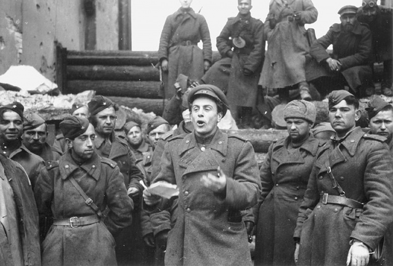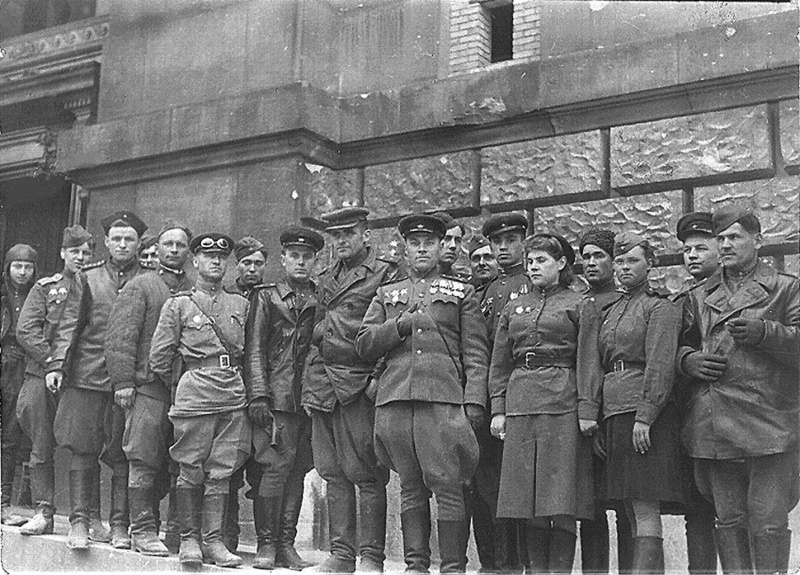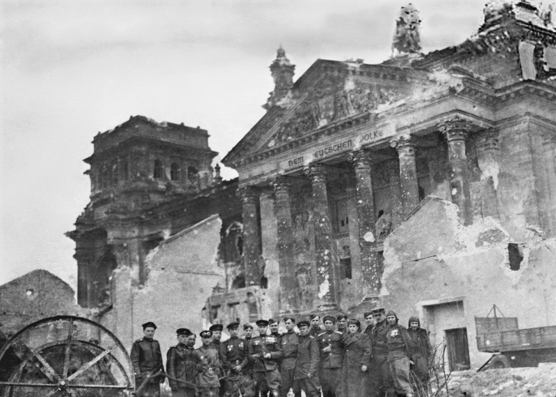 Группа политработников 385-й стрелковой дивизии во главе с начальником политотдела полковником Михайловым у Рейхстага.