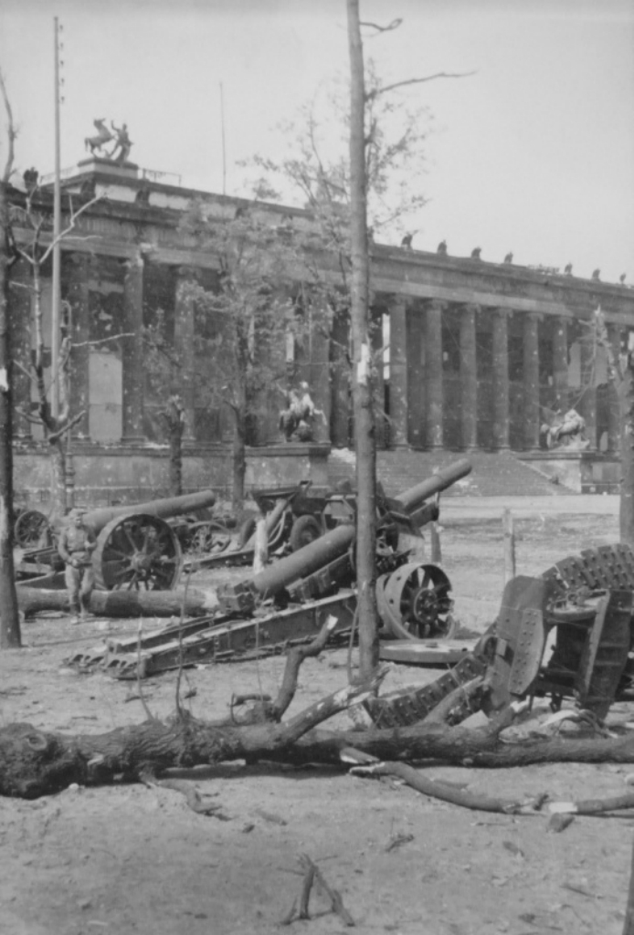 Советский солдат на выставке трофейных артиллерийских систем в берлинском парке Люстгартен.