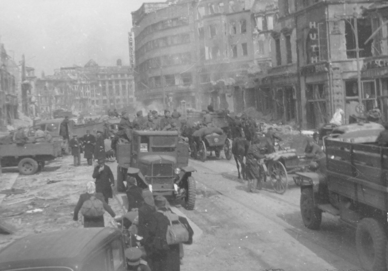 Советские автомобили и немецкие мирные жители на улице Берлина. В центре фото - грузовой автомобиль ЗиС-5В.