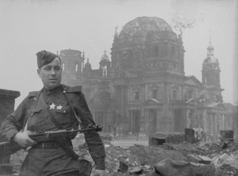 Младший сержант РККА на фоне Берлинского кафедрального собора.
