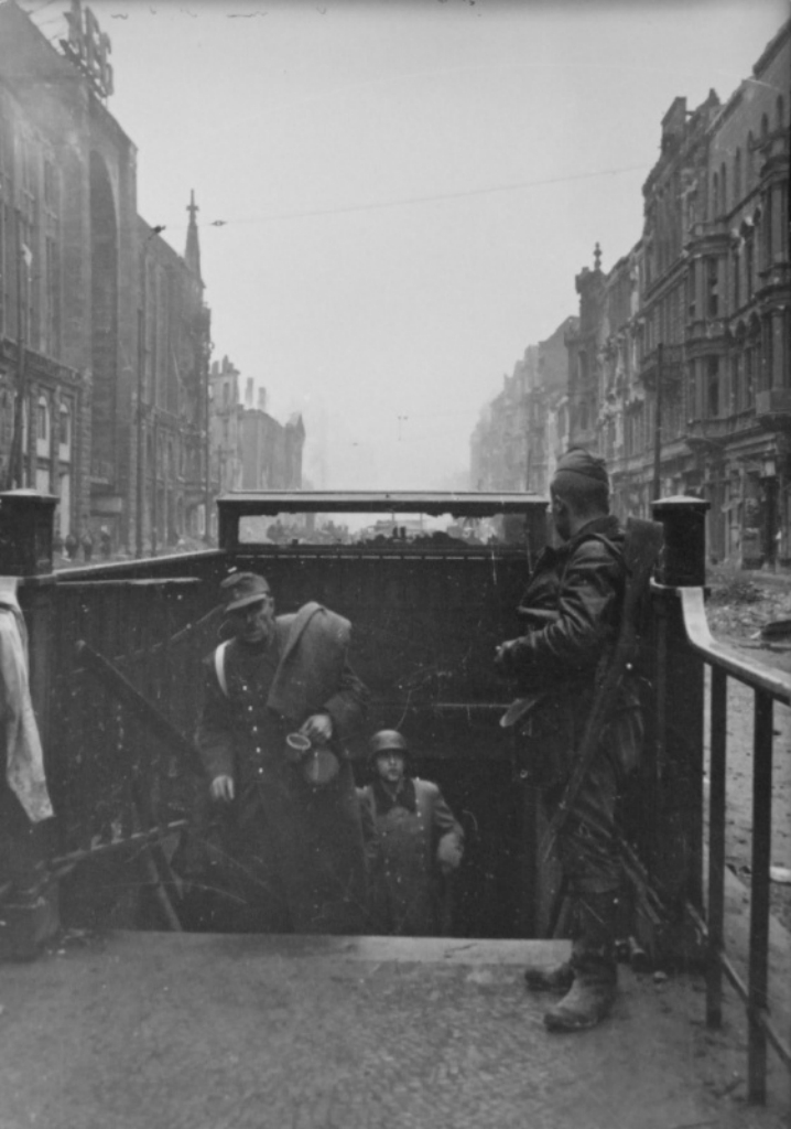 Пленные немецкие солдаты у входа в метро во время капитуляции в Берлине.