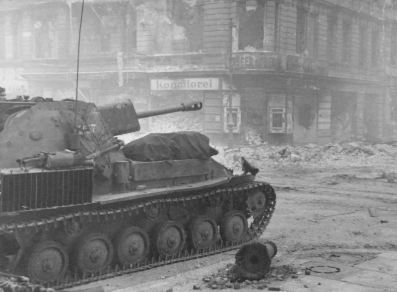 Советская САУ СУ-76М на перекрестке берлинских улиц.